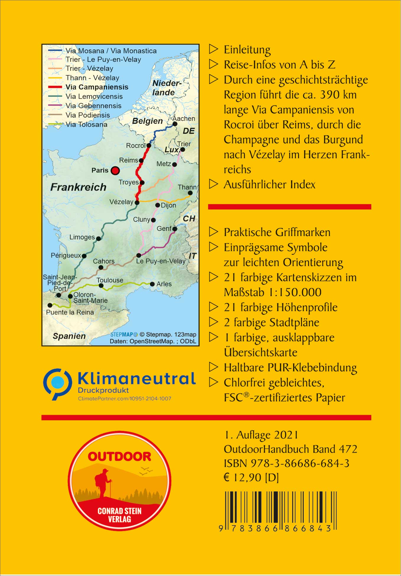 Durch eine geschichtsträchtige Region führt die Via Campaniensis von Rocroi über Reims, durch die Champagne und das Burgund nach Vézelay im Herzen Frankreichs. Sie knüpft nahtlos an die belgischen Jakobswege Via Mosana und Via Monastica an und schließt so die Lücke zur Via Lemovicensis, die von Vézelay weiter nach Saint-Jean-Pied-de-Port führt.