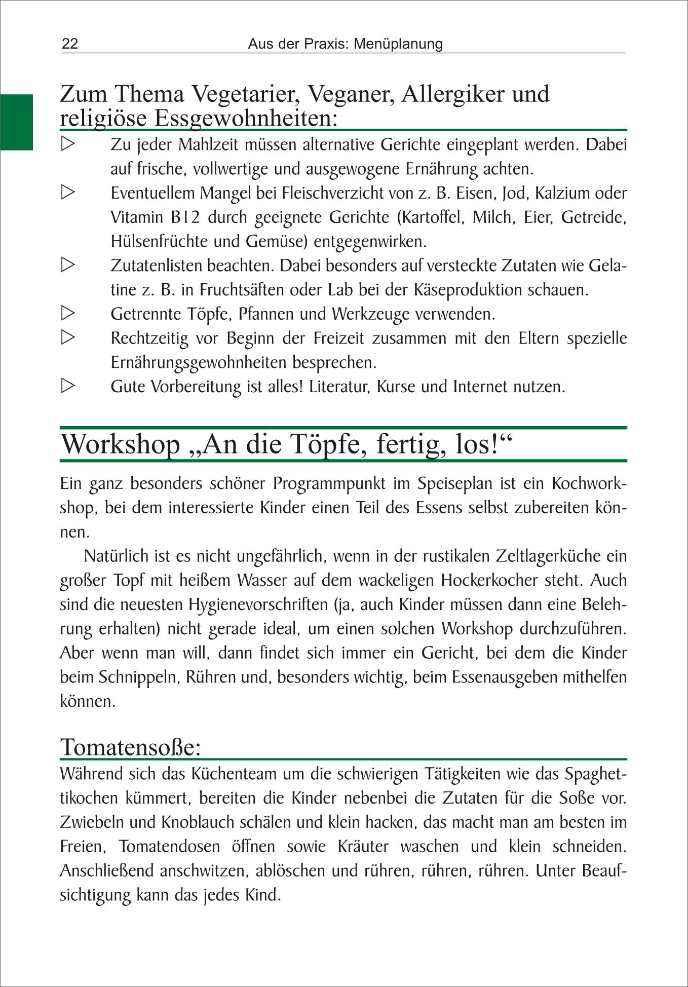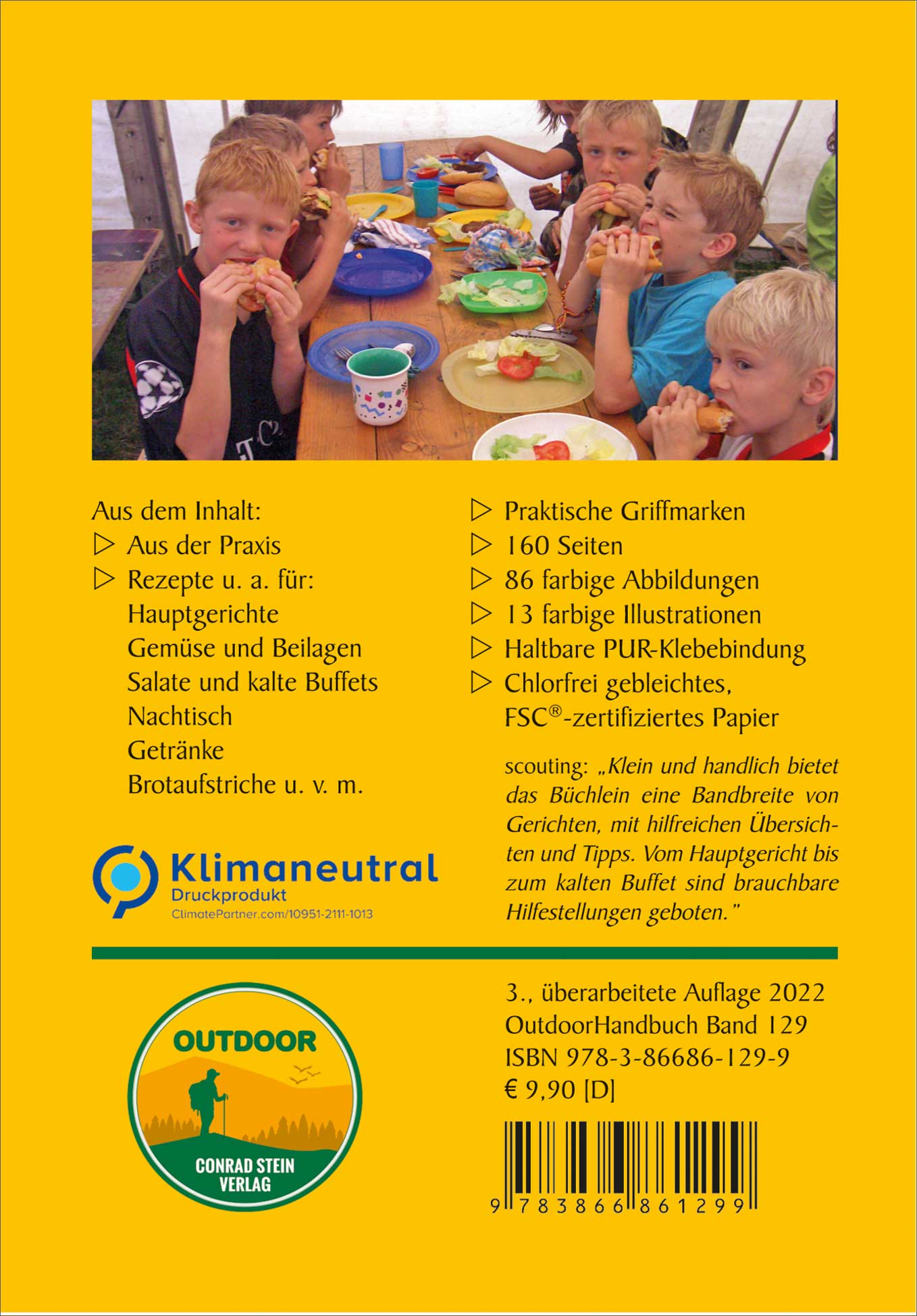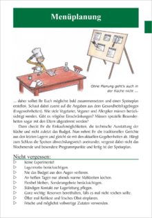 Dieses Zeltlager-Kochbuch beschreibt die “Kunst”, unter einfachsten Bedingungen für große Gruppen zu kochen. Von der Menüplanung bis hin zum Abschlussbüfett begleitet es den Leser bei allen lagertypischen Küchenaktivitäten und unterstützt mit wertvollen Hinweisen, Beispielen und Checklisten. Die Rezepte sind vielfach erprobt und bei den Kindern und Jugendlichen sehr beliebt. Schritt für Schritt wird die Zubereitung der meist frischen, gesunden Zutaten ausführlich erklärt, damit selbst Anfänger leckere Gerichte mit Pfiff auf den Tisch zaubern können. Abgerundet werden die Rezepte durch Tipps und Tricks, die das Arbeiten zum Teil erheblich erleichtern und mögliche Probleme verhindern.