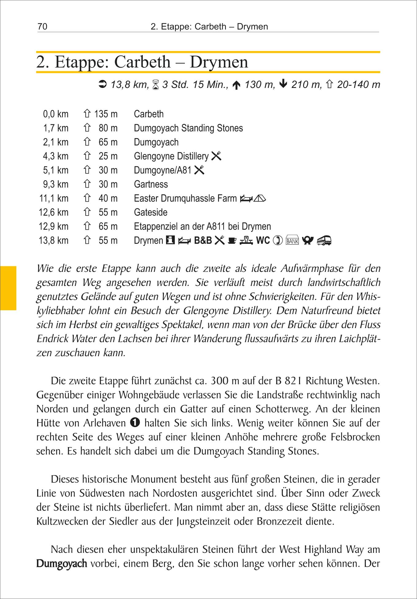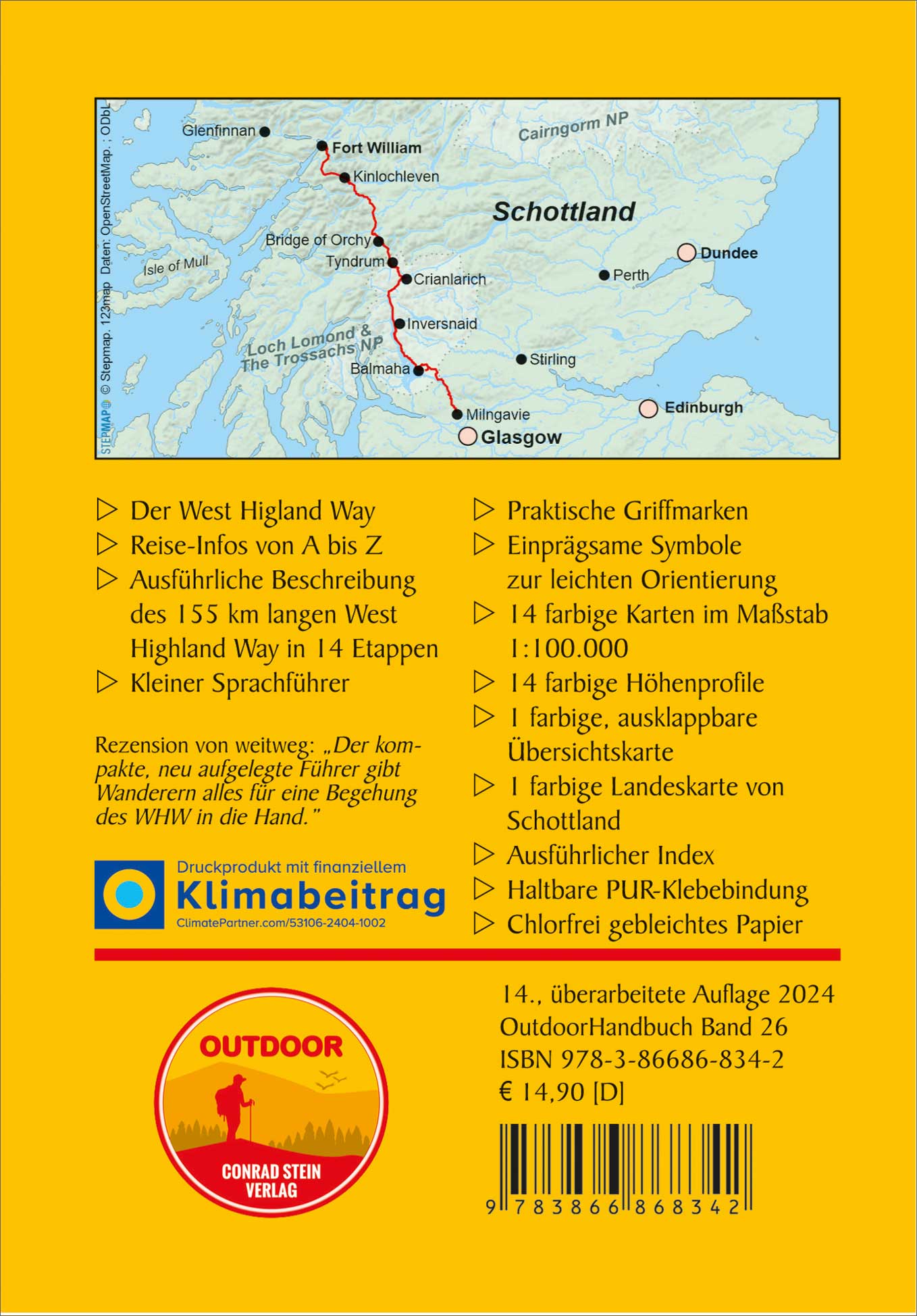 Der West Highland Way ist der schönste Langstreckenwanderweg Schottlands. 155 km führt er durch raues und zerklüftetes Gelände des südlichen und zentralen Hochlands. Es ist eine fantastische, aber streckenweise anstrengende Wanderung. Die Tour wird in 14 Einzeletappen beschrieben, sodass auch Wanderer, die nicht die ganze Strecke laufen wollen, gute Ein- bzw. Ausstiegsmöglichkeiten haben. Jede Etappenbeschreibung umfasst den Wegverlauf, wichtige Tipps wie Übernachtungsmöglichkeiten, Verkehrsverbindungen usw., Informationen zu wichtigen Aspekten von Natur, Landschaft, Kultur und Geschichte sowie eine Beschreibung lohnender Abstecher zu Zielen, die nicht direkt am Weg liegen.