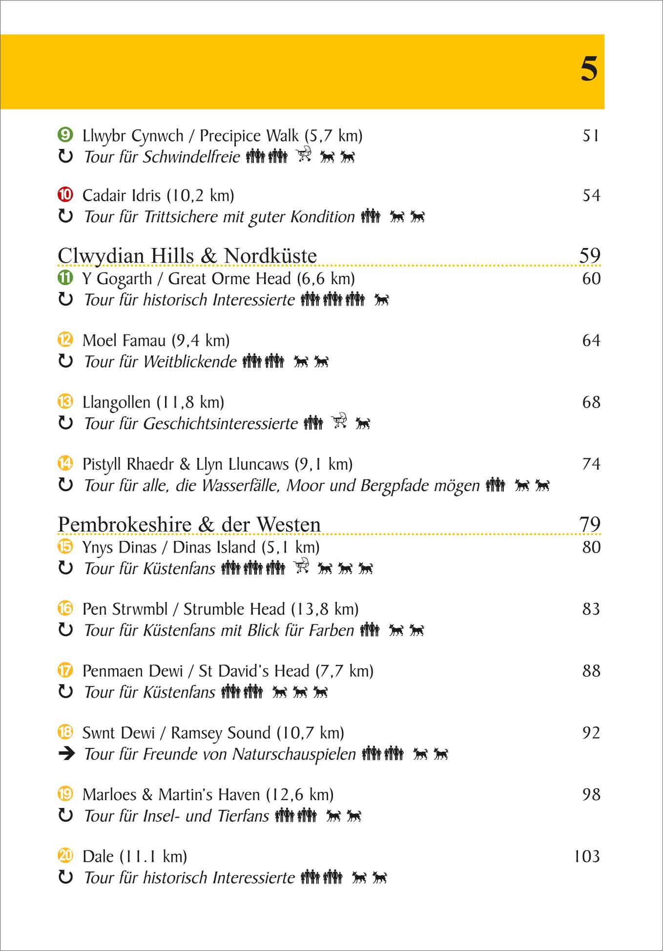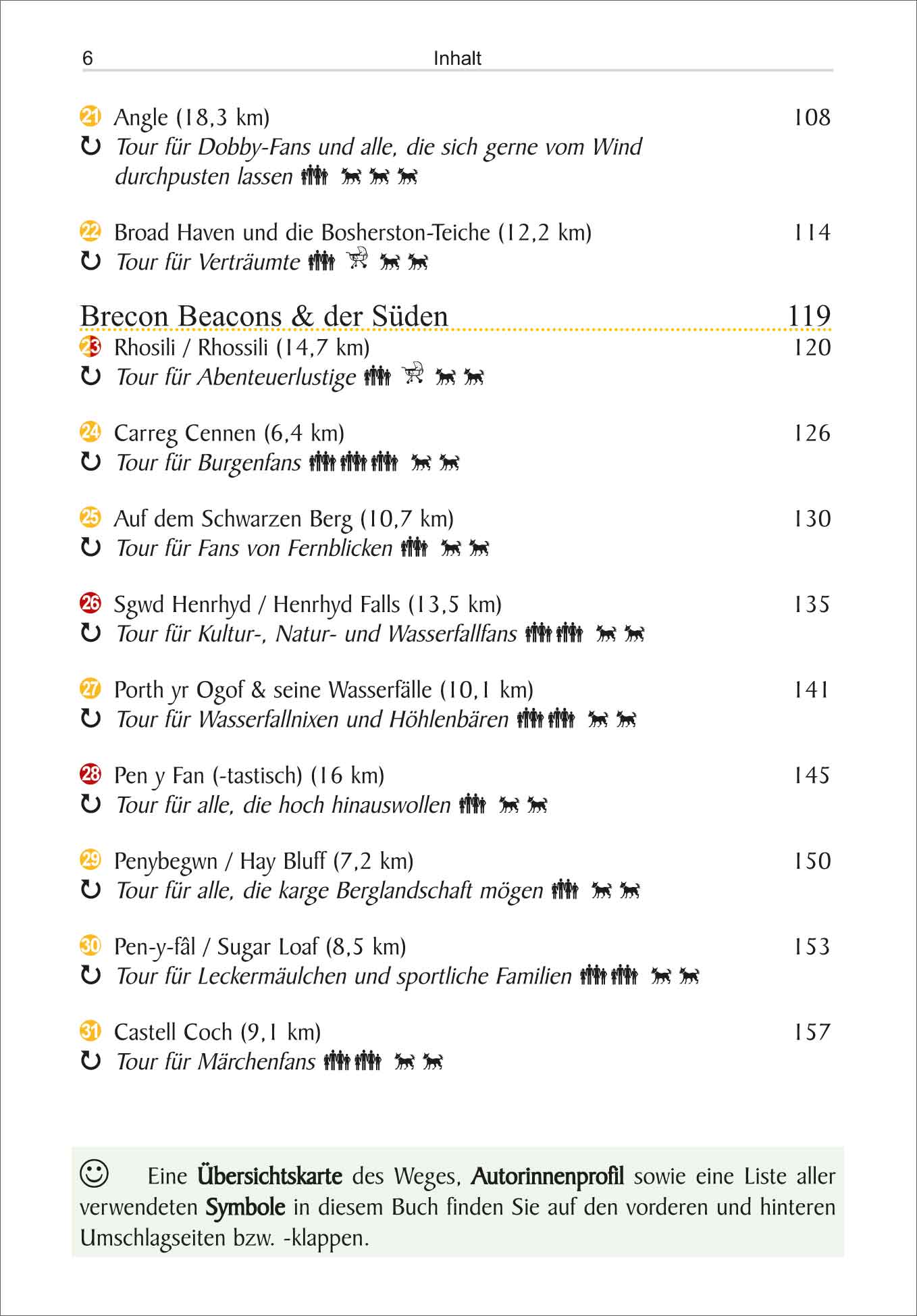 Wales ist ein großartiges Wanderland für jeden Geschmack. Auf 31 handverlesenen Wanderungen geht es in diesem Band durch die atemberaubenden Landschaften: von den mystischen Bergen des Eryri-Nationalparks über die rauen Küstenpfade Pembrokeshires bis hin zu den sanften Hügeln im Bannau-Brycheiniog-Nationalpark. Wasserfälle, alte Burgen und atemberaubende Aussichten sind allerorts zu finden. Jede Wanderung wird detailliert beschrieben, mit hilfreichen Informationen zu Länge, Schwierigkeitsgrad und Sehenswürdigkeiten entlang des Weges. Bei allen beschriebenen Wanderungen gibt es Hinweise darauf, ob sie mit Kindern, Buggy oder Hunde gewandert werden können.